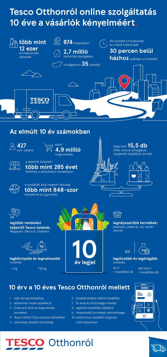 „Köszönjük 427 ezer online vásárlónknak, akik 10 év alatt közel 4,9 millió megrendelést adtak le weboldalunkon, illetve mobilalkalmazásunkban, összesen több mint 285 évnyi időt töltve ezzel. Büszke vagyok kollégáimra, akik lehetővé tették a Tesco Otthonról szolgáltatás folyamatos fejlesztését, így egy évtizede már online is mindig vásárlóink mellett állhatunk. Munkatársaink mára szerte az országban 35 áruházunkban készítik össze az online rendeléseket ugyanolyan gondossággal válogatva az árucikkeket, mint ha vásárlóink maguk pakolnának be a kosarukba. Több mint 12 ezer termék közül választva a friss élelmiszertől a kisállat-felszerelésekig vásárlóink már akár aznapi kiszállítással is kérhetik rendeléseiket egészen a lakásajtóig szállítva, de ha úgy kényelmesebb számukra, személyesen is átvehetik a termékeket Átvételi Pontjaink egyikén a megjelölt egyórás időintervallumban” – mondta Martin Coulam, a Tesco Magyarország működési igazgatója.