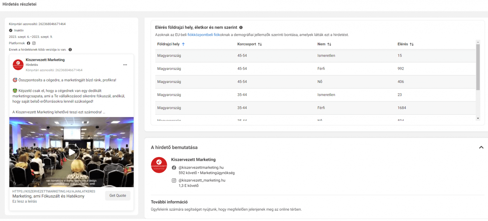 - A hirdetés elérési adatai és teljesítménye;