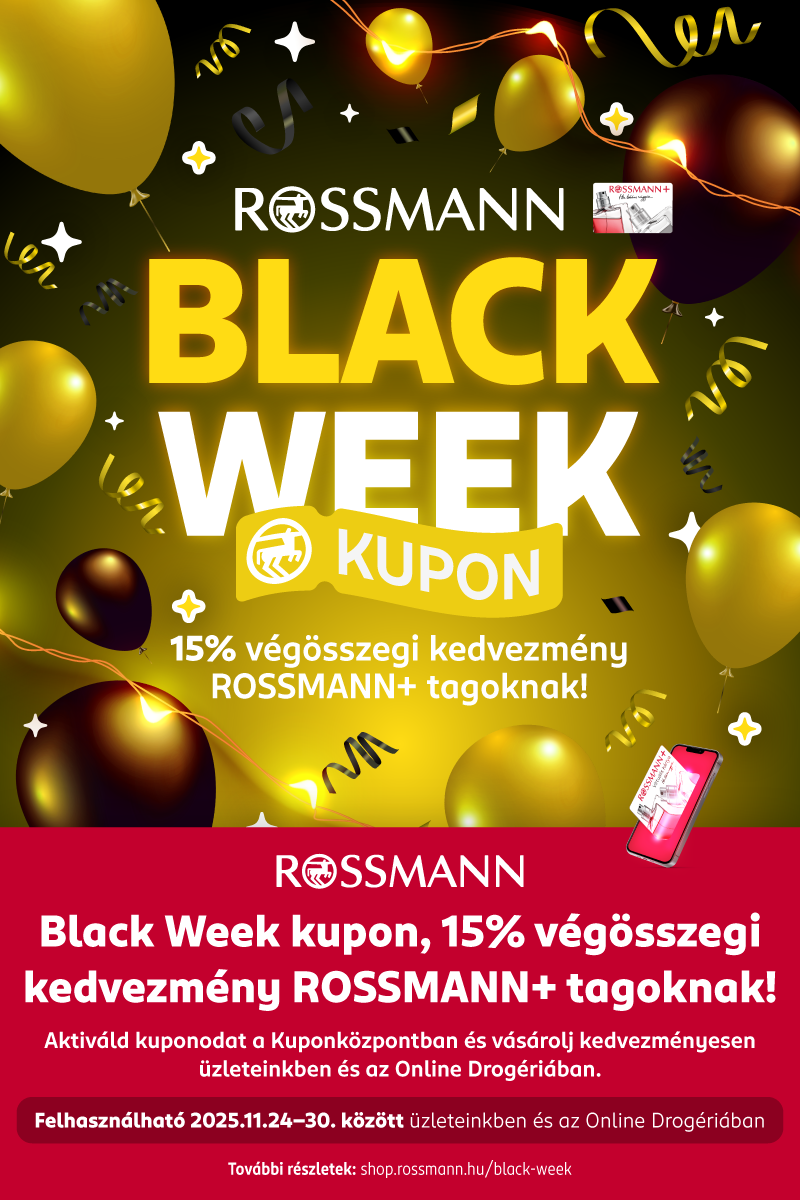 15%-os kedvezménnyel várja a Rossmann+ tagokat november 24-30. között a Rossmann. A kedvezmény érvényesítéséhez a vásárlóknak csupán annyit kell tenniük, hogy a Rossmann applikáció Kuponközpontjában megkeresik és aktiválják a Black Week kupont, majd érvényes ROSSMANN+ kártyával vásárolnak. A 15%-os végösszegi kedvezményt minden regisztrált Rossmann+ felhasználó egyszer, egyetlen kiválasztott vásárlás során használhatja fel.