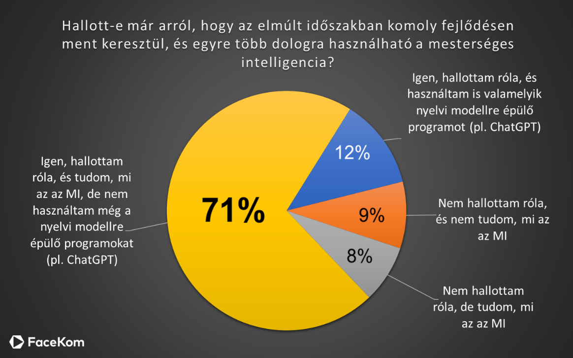 Tíz 18-65 év közötti magyarból kilenc hallott már a mesterséges intelligenciáról, és sokan tudják azt is, hogy ez a technológia az elmúlt időszakban komoly fejlődésen ment keresztül, valamint egyre több dologra használható (83%). A megkérdezettek közül azonban mindössze 12 százalék jelezte, hogy használta valamelyik nagy teljesítményű nyelvi modellező rendszert, például a ChatGPT-t.