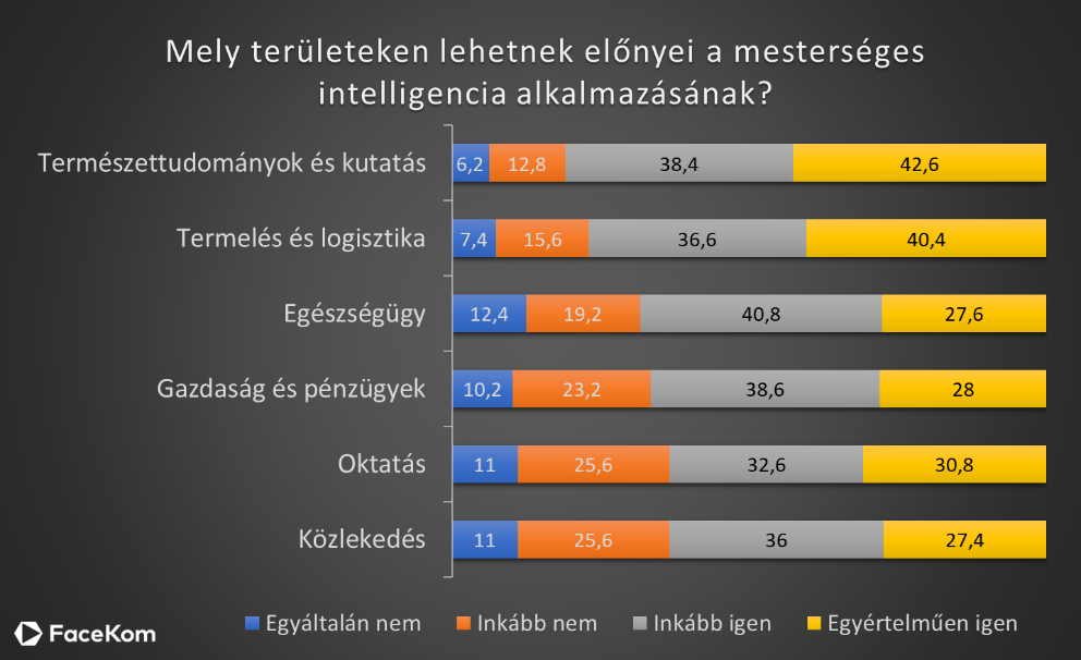 A veszélyek mellett a lehetőségeket is látják a magyarok a gyorsan fejlődő új technológiában. A FaceKom kutatásának eredményei alapján a legtöbben a természet-tudományokat és kutatást (81%), valamint a termelést és logisztikát (77%) jelölték meg, mint olyan területeket, amelyek esetében a mesterséges intelligencia alkalmazásának lehetnek előnyei. Az egészségügy, oktatás és közlekedés területeinél a válaszadóknak nagyjából a harmada nem látja egyértelműen az MI hasznos felhasználási lehetőségeit. A szakértő szerint ez arra utal, hogy sokan nincsenek pontosan tisztában a mesterséges intelligencia potenciáljával, hiszen a fejlődésből ezek az iparágak sem fognak kimaradni. Vélhetően a lakossági vélemények és a technológiával kapcsolatos várakozások is alakulnak majd a következő időszakban annak megfelelően, ahogyan egyre inkább beépülnek a nyelvi modellekre épülő szolgáltatások a mindennapjainkba.