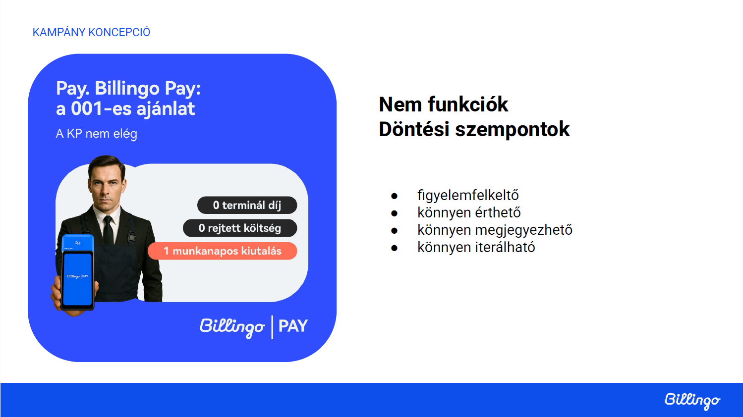 A Billingo Pay pozicionálásakor nem a funkciók kerültek előtérbe, hanem a döntési szempontok. A versenytársakhoz képest a Billingo Pay ajánlata egyszerű, átlátható és kockázatmentes volt: nincs rejtett költség, nincs hűségidő, és a kifizetés egy munkanapon belül megtörténik. Ezek a tényezők sokkal fontosabbak voltak a célcsoport számára, mint a technikai részletek vagy a hardver specifikációi.