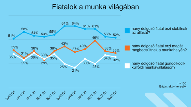 Az elismerés szempontjából kedvezőtlen a kép, a munkahely stabilitását tekintve sem sokkal jobb a helyzet. A dolgozó fiataloknak alig több mint fele, 52 százaléka szerint biztos az állása, ez az elmúlt négy negyedév – egyébként alacsonynak számító – értékeinek megfelelő eredmény. A felmérés történetében 2017 végétől a koronavírus-járvány okozta hanyatlásig, 2020 közepéig a dolgozó fiatalok 60-70 százaléka érezte stabilnak a munkahelyét. A friss kutatás szerint az idei első negyedévben a válaszadók 34 százaléka szerint átlagosnak mondható a munkahely stabilitása, 14 százalékuk szerint van félnivalójuk ezen a téren.
