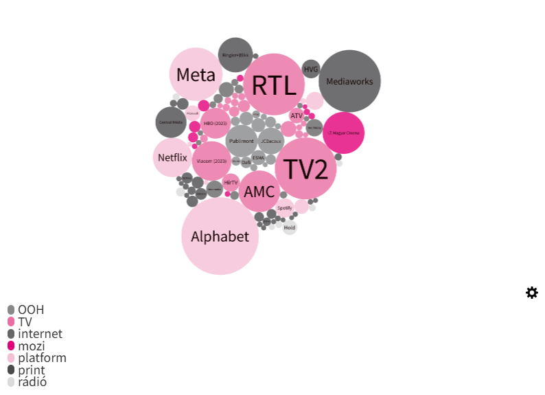 - Magyarországon a top5 médiacég jól illusztrálja az erőviszonyokat: az abszolút piacvezető globális, kettő hazai kormányközeli tulajdonban működik, és két nemzetközi piaci cég – a hazai piaci szereplők nem tudnak e körbe kerülni egyelőre. A top5 cég adja az árbevételek 51%-át.