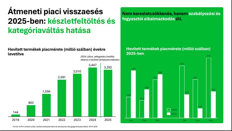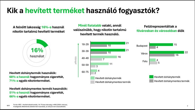 A lakosság közel harmada hagyományos cigarettát fogyaszt, és a cigarettázók többsége rendszeres használónak számít, ami tovább erősíti a klasszikus dohánytermékek dominanciáját. Ugyanakkor a cigarettát használók több mint fele nyitott az alternatív - hazánkban legálisan elérhető - hevítéses, dohánymentes, nikotint tartalmazó megoldások kipróbálására is. Ezen kategóriában, különösen – az engedélyezett - ízesített változatok iránt mutatkozik nagyobb érdeklődés, ami a fogyasztói preferenciák lassú átalakulására utal.